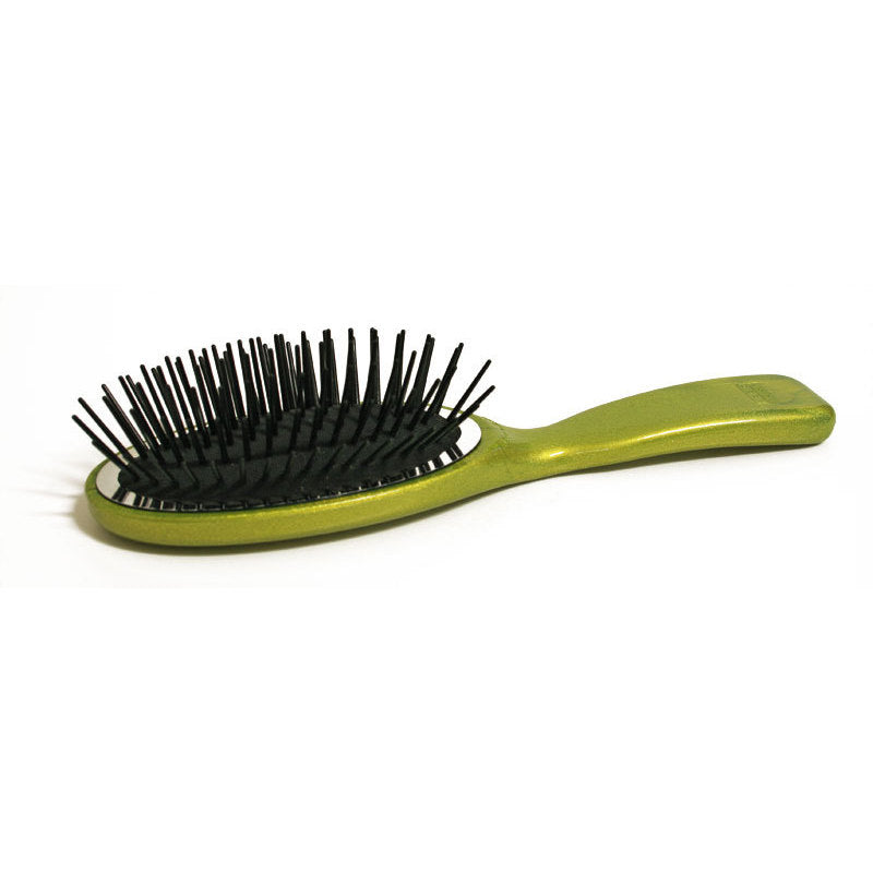 Spazzola ovale da borsetta con manico in plastica e spilli resistenti al phon.