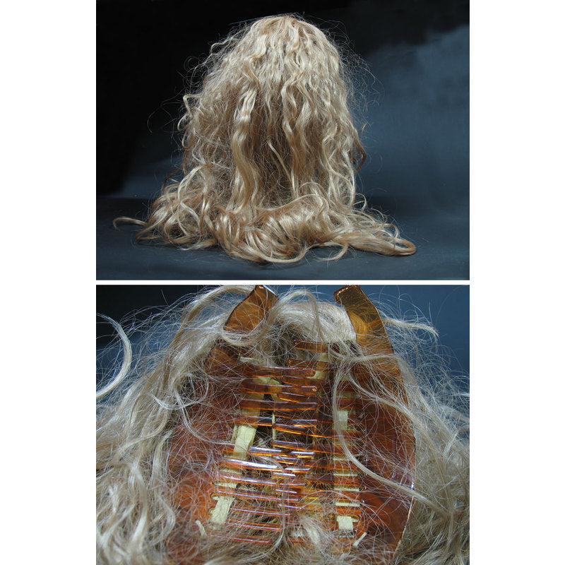 Toupet in fibra sintetica lunghezza 35 cm. Colore: biondo chiarissimo beige. Leggermente ondulata. Lavabile in acqua tiepida con sapone di Marsilia. Dotata di pettini per l'applicazione. Ultimo pezzo.