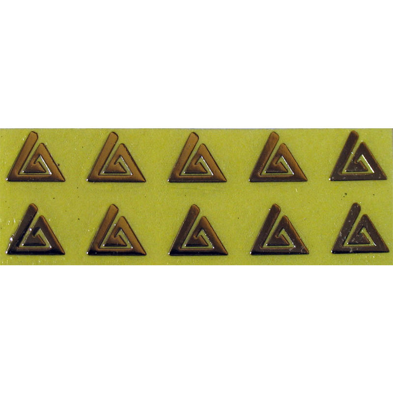 Decoro per nail art ricavato su una sottile sfoglia metallica adesiva per ottenere un innovativo effetto creativo sulle tue unghie. Motivo: spirale triangolare. Colore: oro.
