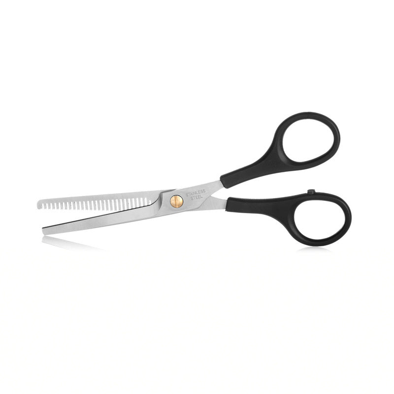 Forbice da sfoltire economica professionale con una lame dentata in acciaio inox e manici in plastica.