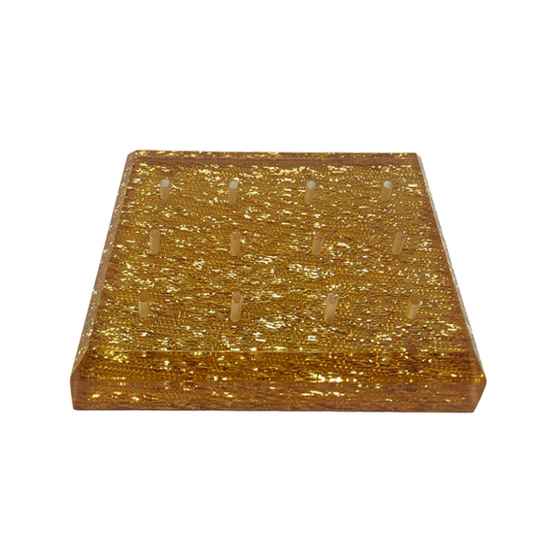 Elegante portafrese in metacrilato trasparente con sfondo dorato e 12 forellini per riporre le frese.