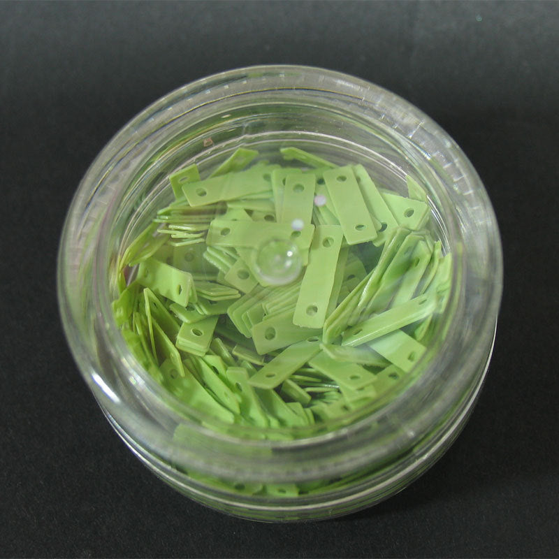 Decori per unghie a forma di piccoli rettangoli con due fori alle estremità. Colore verde.