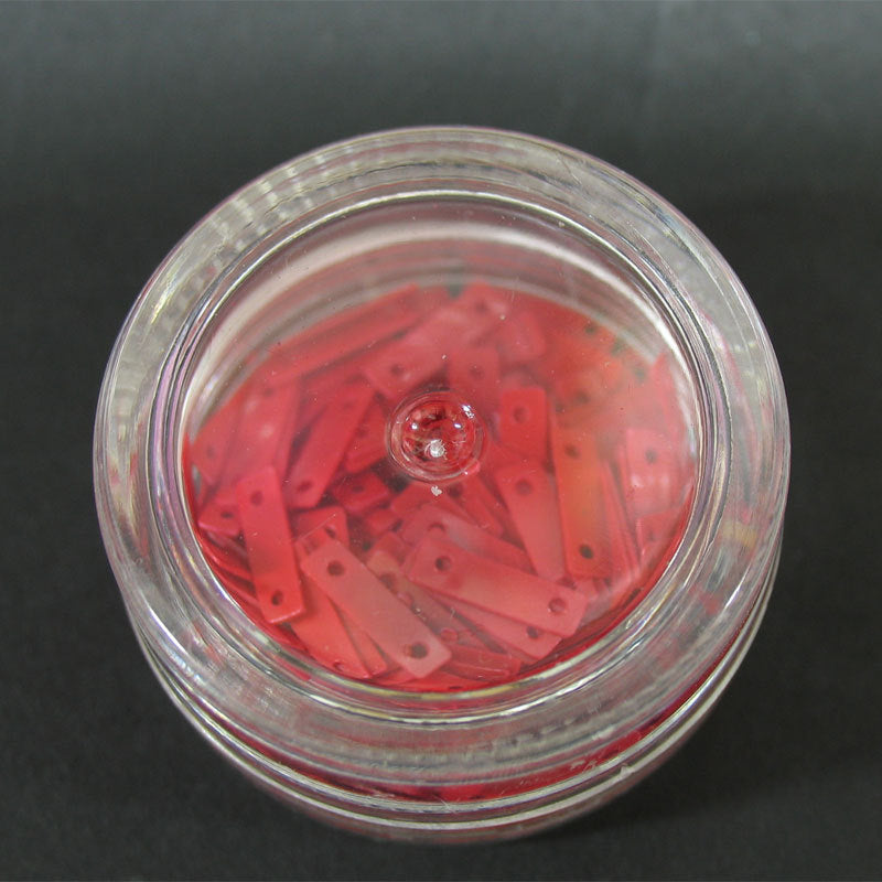 Decori per unghie a forma di piccoli rettangoli con due fori alle estremità. Colore rosso.