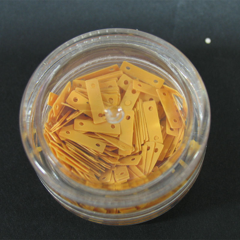 Decori per unghie a forma di piccoli rettangoli con due fori alle estremità. Colore ocra.