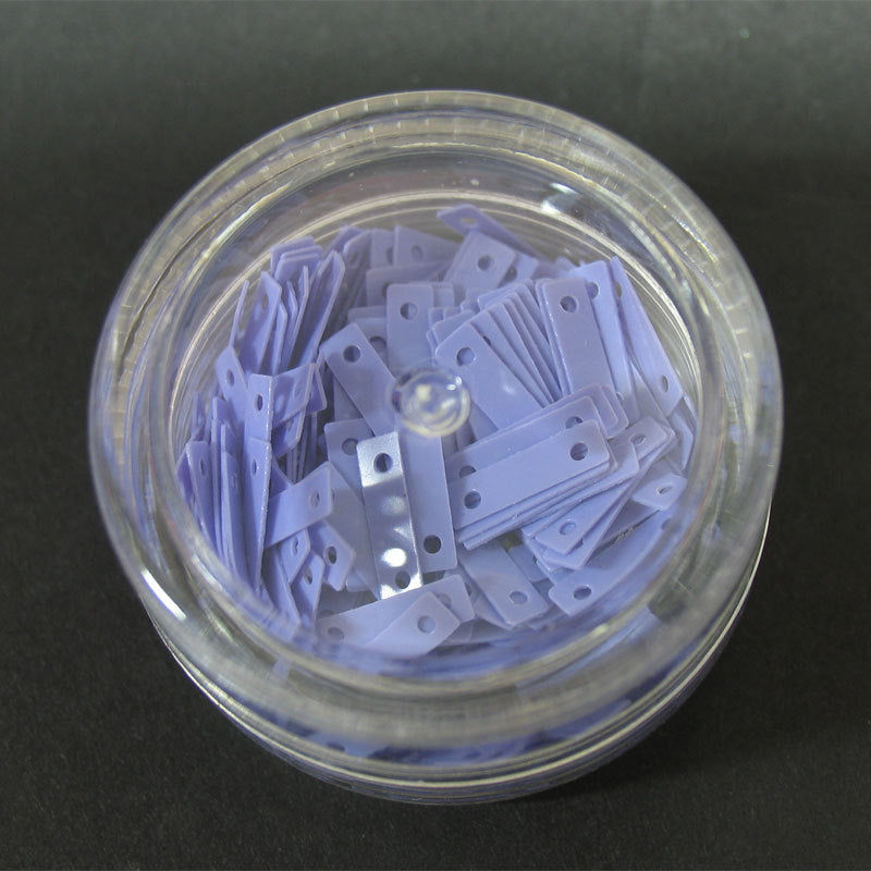 Decori per unghie a forma di piccoli rettangoli con due fori alle estremità. Colore lilla.