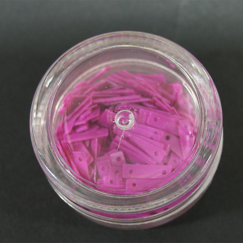 Decori per unghie a forma di piccoli rettangoli con due fori alle estremità. Colore fucsia.
