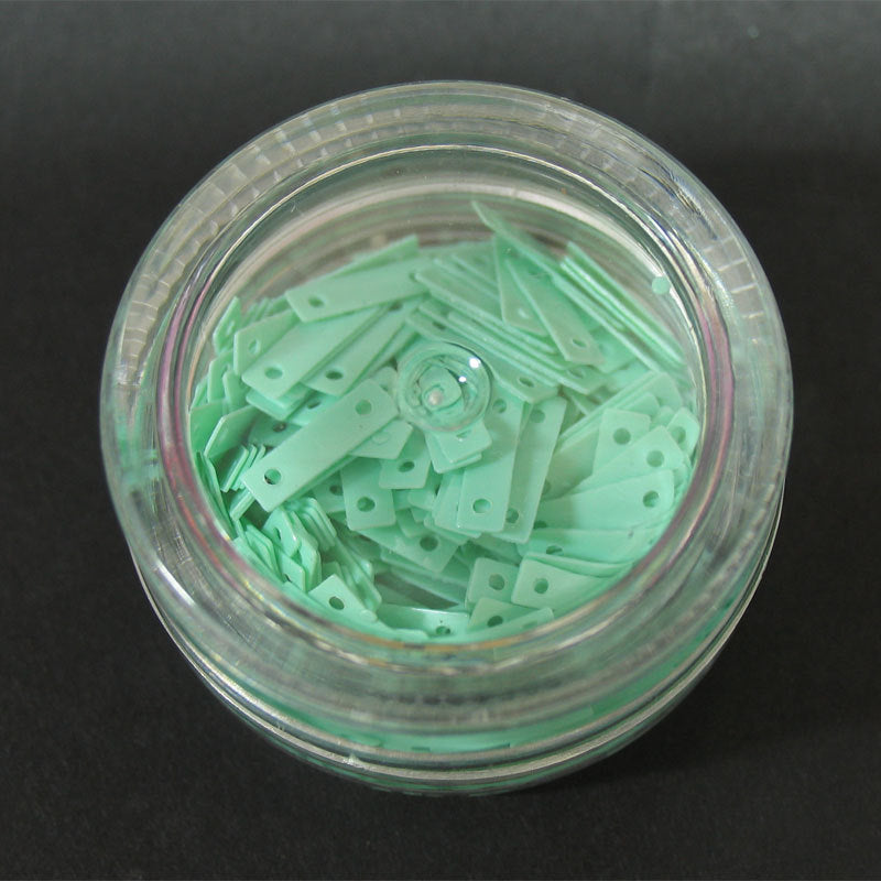 Decori per unghie a forma di piccoli rettangoli con due fori alle estremità. Colore acquamarina.