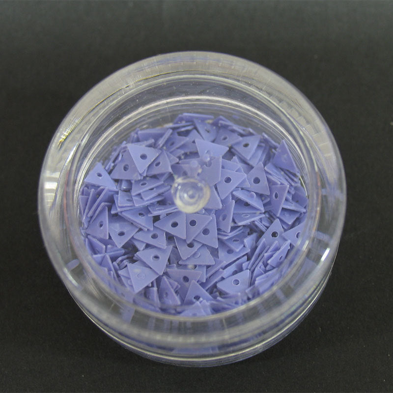 Decori per unghie a forma di piccoli triangoli con un foro centrale. Colore lilla.