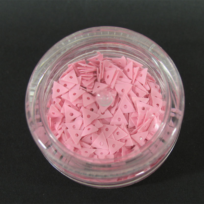Decori per unghie a forma di piccoli triangoli con un foro centrale. Colore rosa.