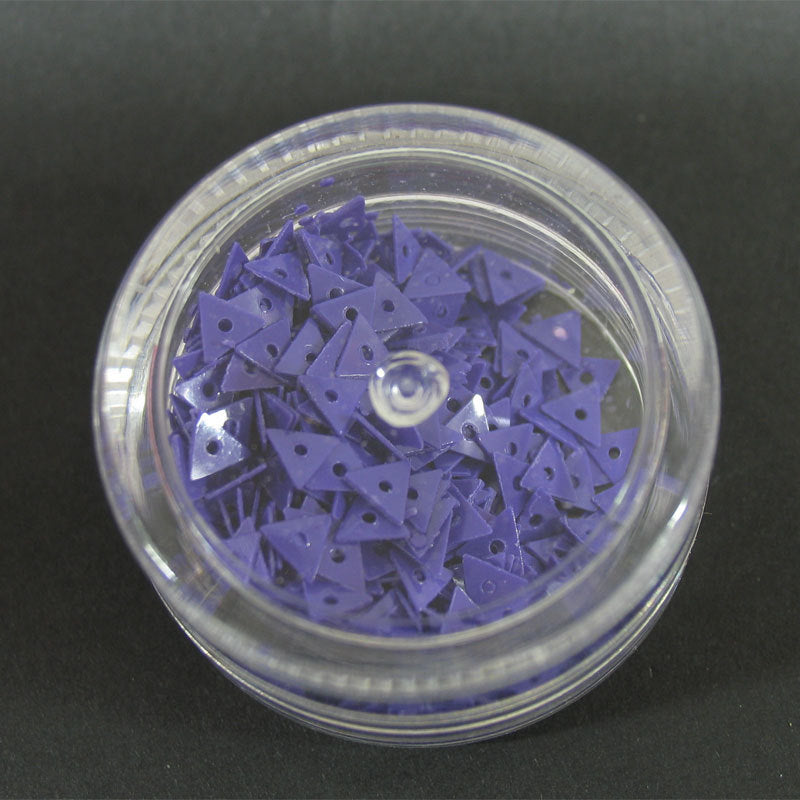 Decori per unghie a forma di piccoli triangoli con un foro centrale. Colore viola.