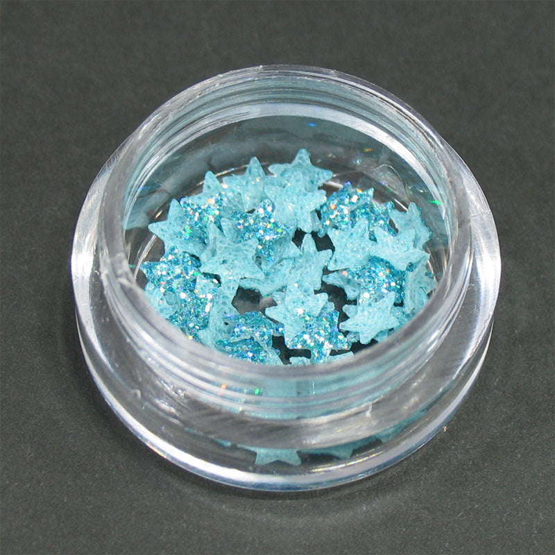 Decoro per unghie a forma di stellina tridimensionale con un lato ricoperto di brillantini iridescenti.