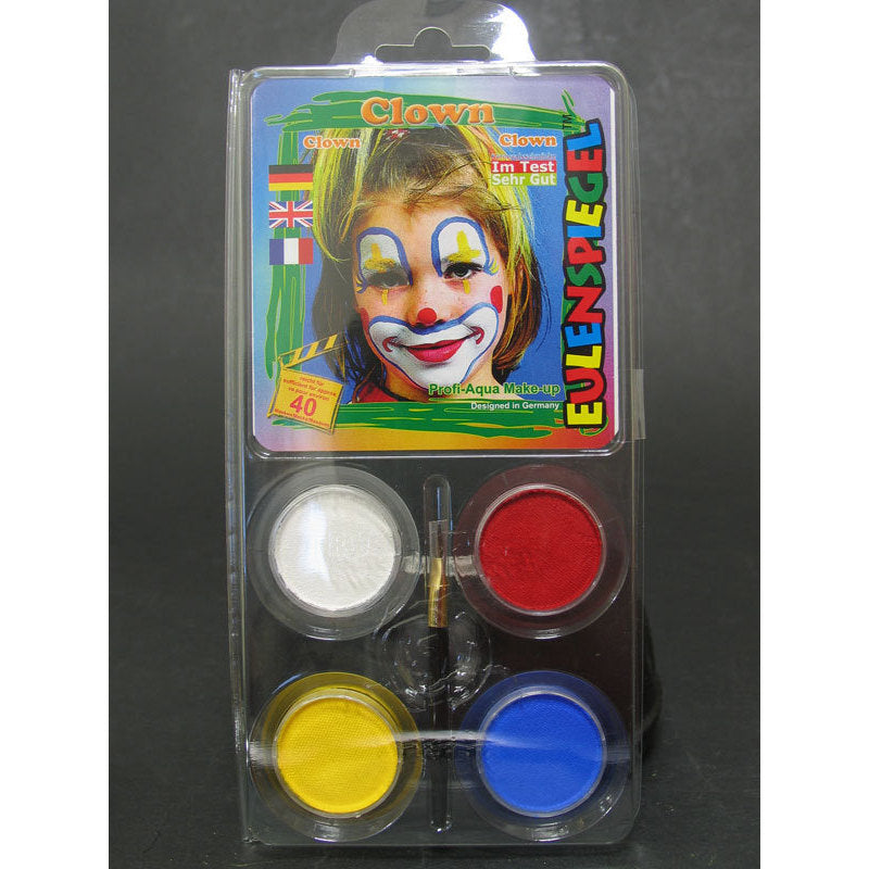 Completo kit per make up ad acqua composto da 4 colori (bianco, rosso, giallo, blu) e 1 pennellino. Adatto a realizzare numerose maschere come quella del clown.