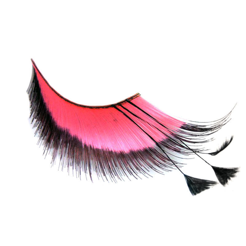 Maxi ciglia finte di colore nero e rosa con piume nere.