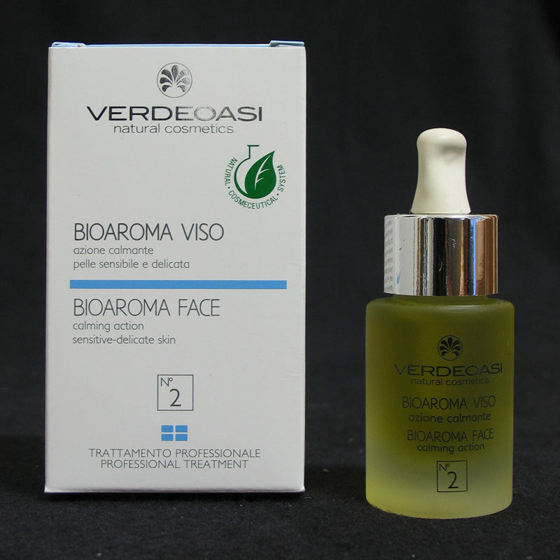 Bioaroma Viso N° 2 è un vero concentrato aromatico studiato per il trattamento specifico delle pelli sensibili e delicate dalla texture ricca e setosa. Nel cuore della sua formula sono racchiusi gli Oli di Nocciola BIO e il Principio Attivo Integrale dell'Aloe Vera, in perfetta sinergia con gli Olii Essenziali purissimi di Camomilla, Geranio, Sandalo, Cipresso, Niaouli, Lavanda, Alpha Bisadololo, oltre all'Estratto Integrale di Azulene puro.