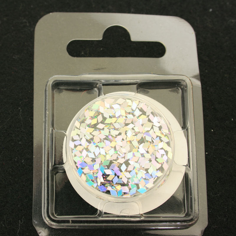 Pagliuzze a forma di diamante per realizzare originali trucchi di carnevale. Colore argento cangiante.