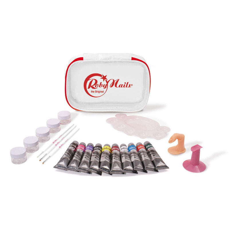 Contiene i prodotti necessari per realizzare le tecniche più ricercate di nail design con pittura acrilica. All'interno il set di 10 colori, comprensivi dei colori primari e altre brillanti tonalità che, mischiate fra loro, permettono di ottenere una svariata gamma di sfumature. I pennelli, dedicati alla micropittura, la tavolozza, un pratico appoggio per dito e altri accessori, sono contenuti nell'elegante pochette RobyNails.