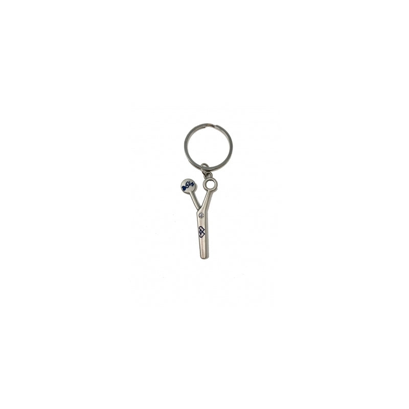 Portachiavi in metallo con ciondolo a forma di forbice da parrucchiere.