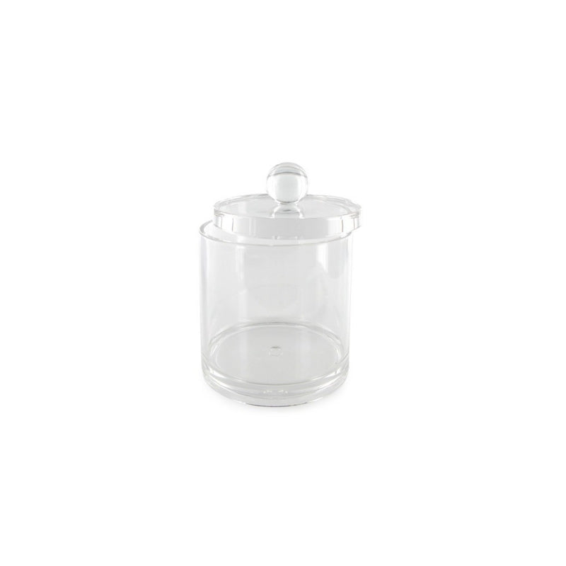 Vaso in acrilico trasparente con coperchio adatto a contenere utensili e materiali di consumo per estetica e barbieri.