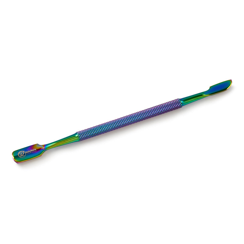 Spingipelle professionale per mani e piedi in acciaio inox multicolor. Dotato di 2 estremità: una concava per spingere le cuticole e l'altra a lancia per rimuovere la pelle in eccesso e ripulire la parte sottostante dell'unghia. Sterilizzabile in autoclave.