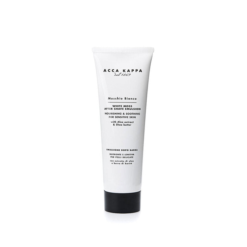 Emulsione dopo barba della linea Muschio Bianco per uomo di Acca Kappa, è nutriente e lenitiva grazie alla presenza di estratti di Tè Verde e burro di Karitè che la rende particolarmente apprezzabile anche da parte di coloro che hanno il problema di avere una pelle sensibile.