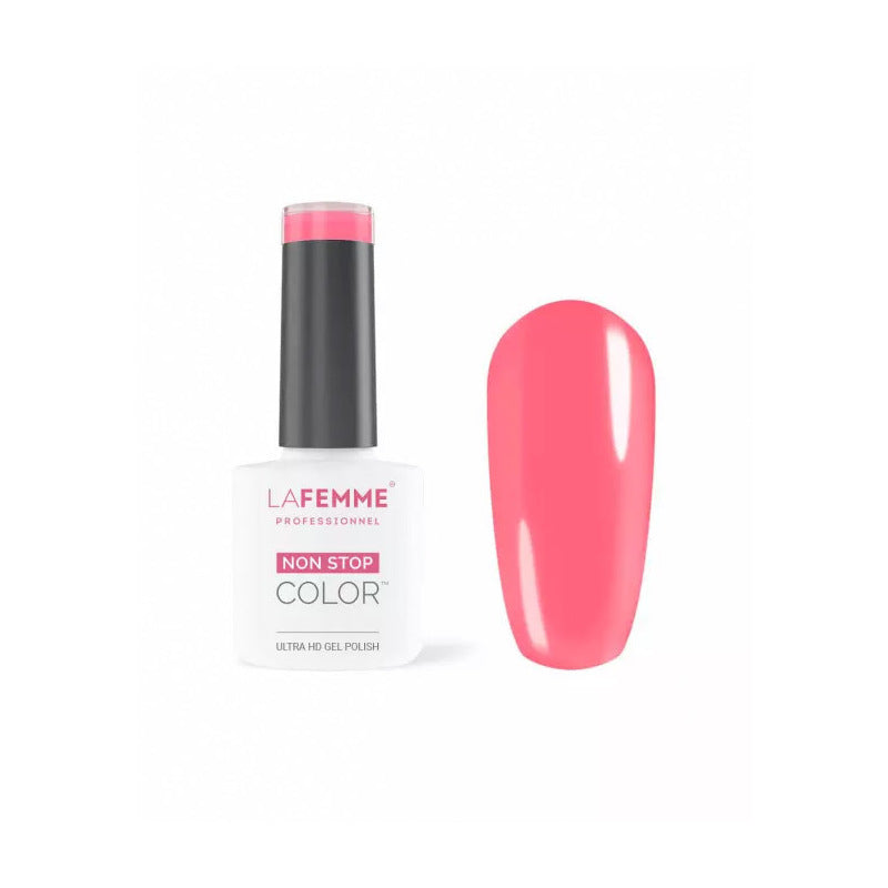 Lo smalto gel Fucsia coprente Non Stop Color™ garantisce per oltre 21 giorni un’eccellente durata, ha un effetto super high gloss ed è resistente a graffi e urti. Facilissimo da stendere, polimerizza in lampade UV o LED in pochissimi secondi e si rimuove facilmente in 5-10 minuti. La sua speciale formulazione 7-Free offre una protezione totale delle unghie naturali, ha un profumo piacevole e permette di essere combinato con tutti i sistemi di ricostruzione La Femme®.
