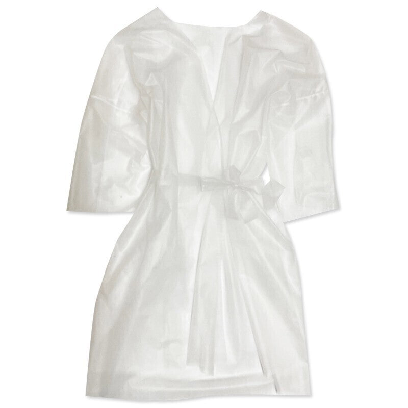 Kimono monouso realizzato in tessuto non tessuto adatto per servizi in cabina di estetica o per proteggere gli indumenti durante le fasi di lavorazione dal professionista.