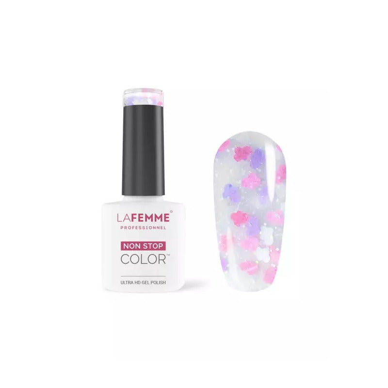 Lo smalto semipermanente con base Trasparente Glitterata con Nuvole Rosa, Lilla e Bianche Non Stop Color™ della collezione Sky Nails di La Femme® garantisce per oltre 21 giorni un’eccellente durata del colore e una brillantezza senza eguali grazie alla formula Ultra High Gloss.